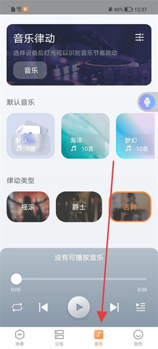4、點擊底部音樂選項進入音樂律動頁面,選擇海洋、夢幻等音樂分類,以及搖滾、爵士、古典等律動類型。