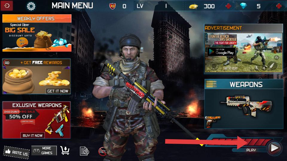 1、進入游戲主菜單,能看到金幣,鉆石數量,還有武器展示和PLAY按鈕,點擊可開啟槍戰任務。