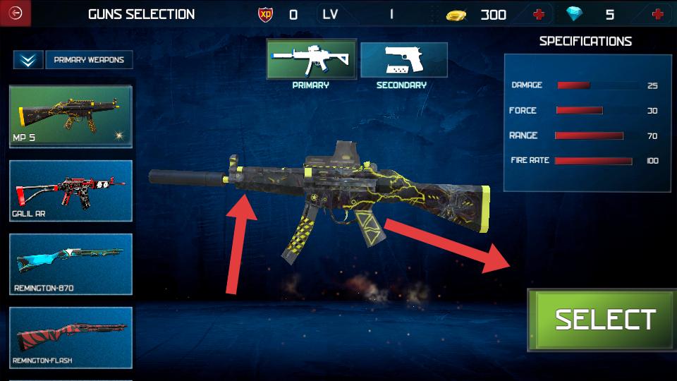 2、在武器選擇界面,可挑選主武器,查看武器的傷害,射程等屬性,選好后點擊SELECT確定。