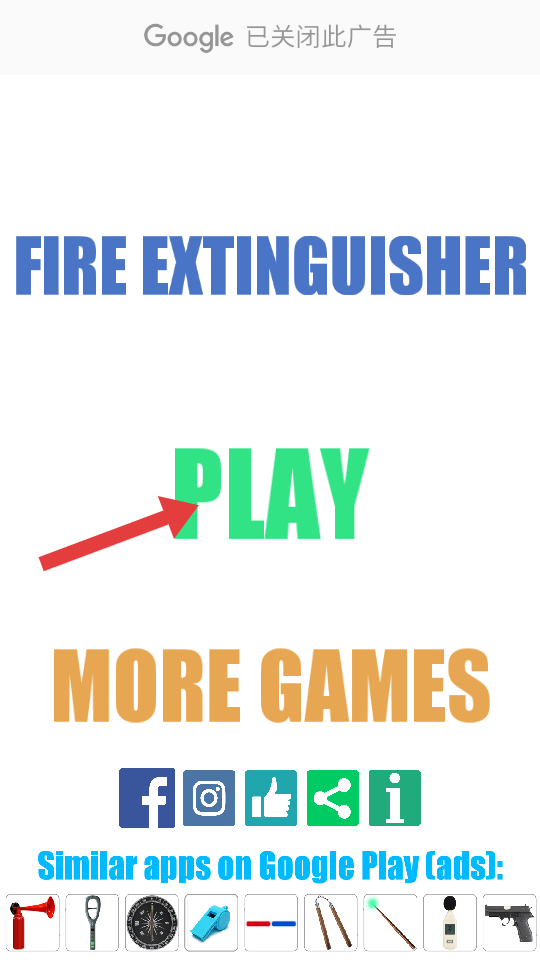 1、進入游戲界面,看到FIRE EXTINGUISHER標題,按紅色箭頭指向,點擊PLAY,開始滅火器操作挑戰。