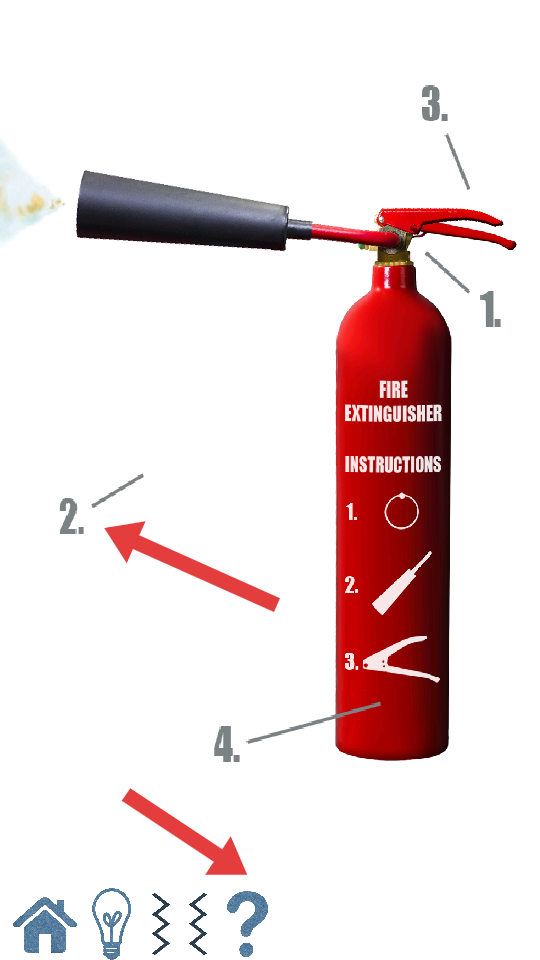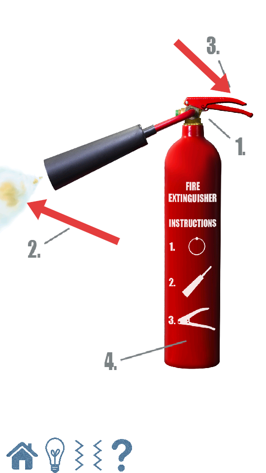 3、面對滅火器圖示,根據紅色箭頭指引,依次了解1,2,3,4步驟對應的部件,點擊下方問號等按鈕,學習操作。