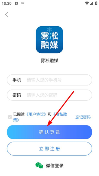 3、登錄頁面,可輸入手機號和密碼,閱讀并同意相關協議后點擊確認登錄,也可選擇微信登錄或立即注冊。