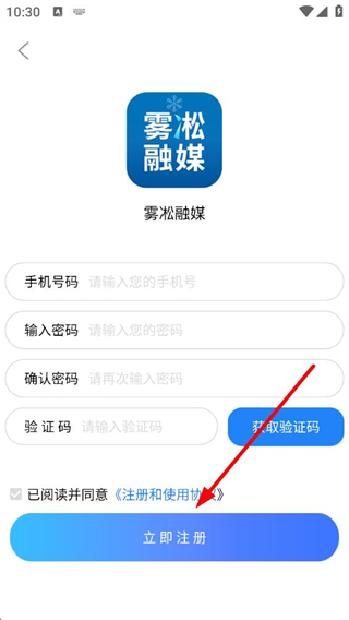 4、注冊頁面,輸入手機號碼、密碼,獲取并輸入驗證碼,閱讀并同意相關協議后點擊立即注冊,完成賬號注冊流程。