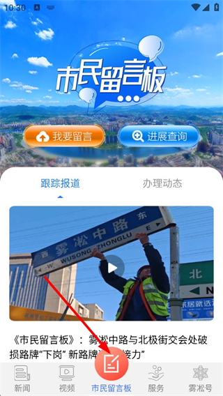 2、點擊底部市民留言板按鈕,進入市民留言板頁面,可進行我要留言、進展查詢,參與跟蹤報道和辦理動態的查看。