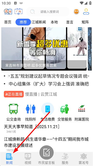 1、進入霧凇融媒APP新聞頁面,可看到首頁、推薦等多個欄目,還有公交查詢、生活繳費等服務入口,能瀏覽本地新聞和使用便民服務。
