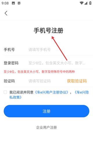 2、注冊界面需填手機號設復雜密碼,獲取并填驗證碼,勾選協議后注冊,另有企業用戶注冊入口。