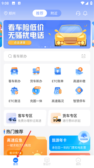 3、首頁聚合車主服務,含ETC新辦激活,高速賬單路況,智慧停車,還提供車險查詢和應急求助。