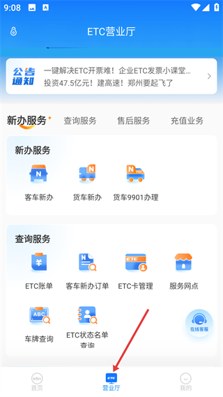 4、ETC營業廳分四大模塊,可辦客貨車ETC,查賬單訂單,管ETC卡,還推送相關公告通知。