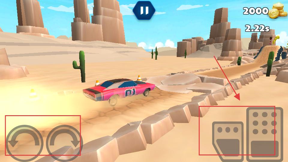 2、在賽道上利用左側的方向按鈕操控賽車轉向,點擊右側的加速等按鈕,讓賽車在沙漠賽道上行駛,躲避障礙物,收集金幣。