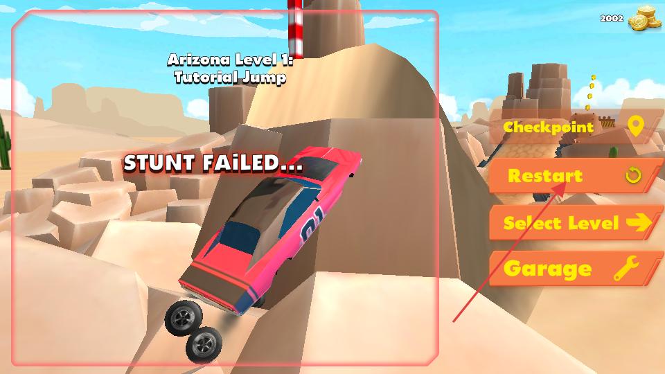 4、若特技失敗界面顯示STUNTFAILED,此時點擊Restart按鈕,重新開始該關卡的挑戰,繼續操控賽車在沙漠賽道上行駛、收集金幣和完成特技。