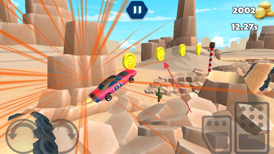 3、遇到坡道時操控賽車沖向坡道,讓賽車騰空,嘗試在空中收集金幣,完成特技動作,同時注意落地時的平穩,避免賽車失控。