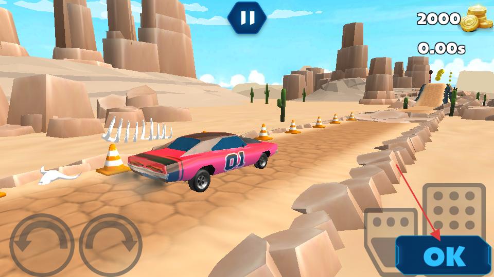 1、打開游戲點擊OK按鈕,進入沙漠賽車場景,看到粉色賽車和賽道上的障礙物、金幣等,準備操控賽車開始挑戰。