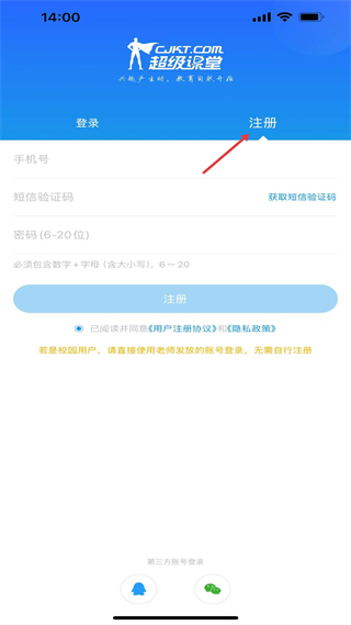 2、注冊頁需填寫手機號、短信驗證碼、密碼含數字和字母,勾選同意協議后注冊,校園用戶可使用老師發放賬號登錄。