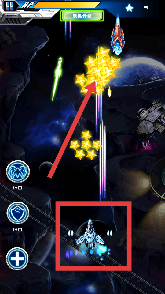2、進入游戲后玩家操控紅框內的戰機進行戰斗,通過在屏幕上滑動手指來移動戰機,躲避敵方發射的子彈和攻擊。
