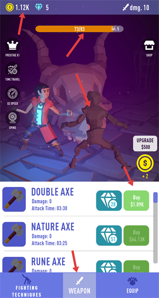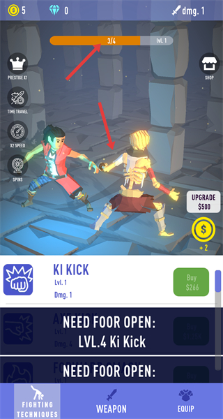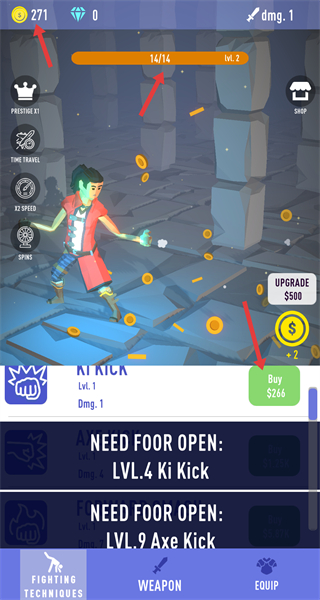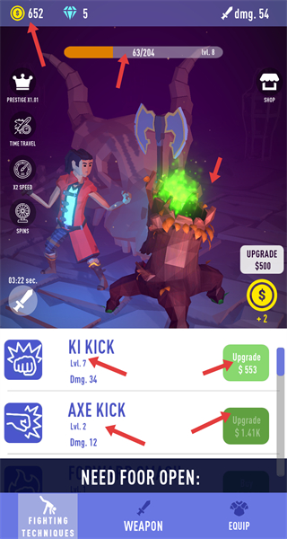 4、除了購買武器還可升級已有的戰斗技能,消耗金幣提升技能等級,增加技能傷害,讓角色在戰斗中更具優勢。