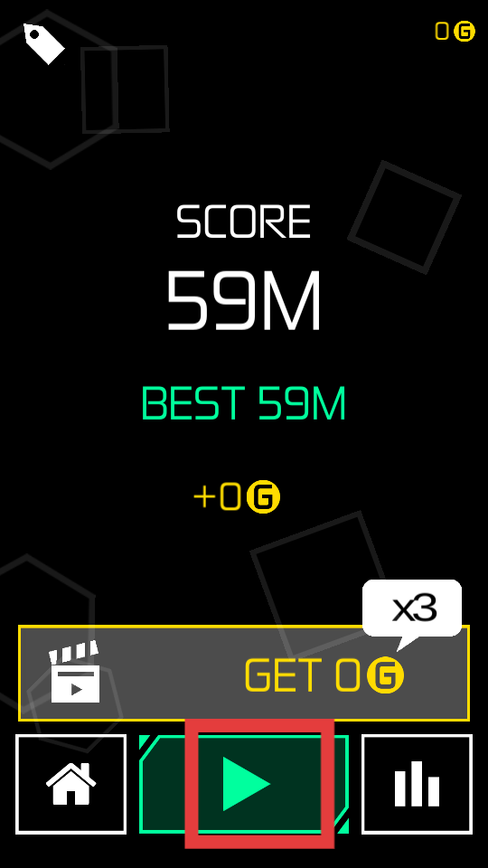 3、當飛機碰到障礙物或達到游戲結束條件后,會出現游戲結束界面,玩家可以點擊紅框內的綠色播放按鈕,重新開始游戲挑戰更遠的飛行距離,沖擊更高的分數記錄。