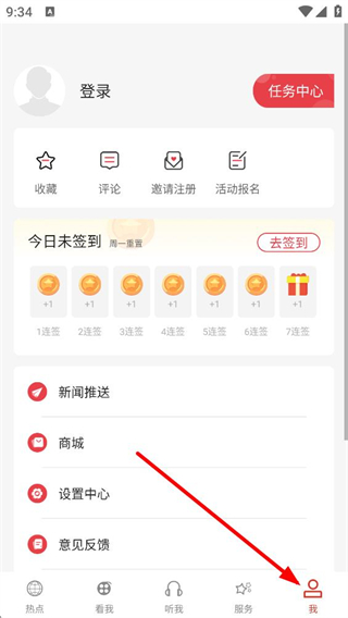 2、點擊底部我按鈕,進入個人頁面,可進行登錄,使用收藏、評論等功能,還能參與簽到領金幣活動。