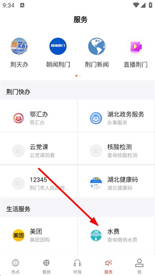4、點擊底部服務按鈕,進入服務頁面,可使用荊天辦、朝聞荊門等新聞服務,還有荊門快辦、生活服務等各類實用服務,比如查詢繳納水費。