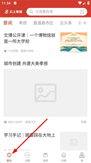 1、進入云上孝感應用后,要聞頁面可瀏覽要聞、孝感等各類資訊,還有點播、電視等功能入口,能獲取本地新聞和視聽內容。