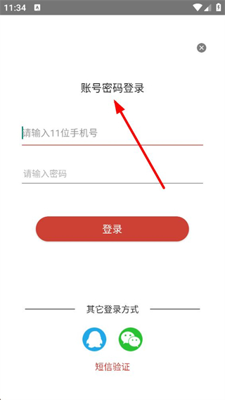 3、登錄選擇界面可選擇賬號密碼登錄,輸入11位手機號和密碼后點擊登錄,也可選擇QQ、微信等其它登錄方式。