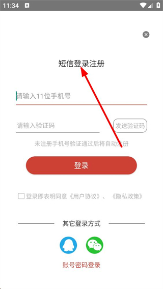4、也可選擇短信登錄注冊,輸入11位手機號、獲取并輸入驗證碼,勾選用戶協議和隱私政策后點擊登錄,未注冊手機號驗證后自動注冊。
