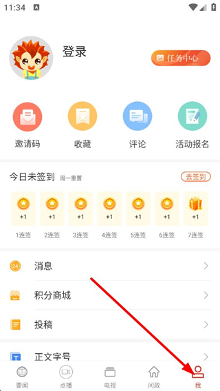 2、點擊底部我按鈕,進入個人中心界面,可看到邀請碼、收藏等功能,還有簽到模塊和積分商城等,點擊登錄可進入登錄選擇界面。