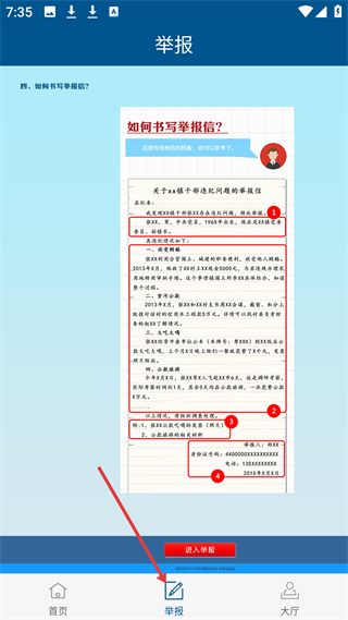 2、舉報板塊,提供舉報信書寫模板,指導明確被舉報對象、違紀情況、附證材料及舉報人信息,設進入舉報入口。