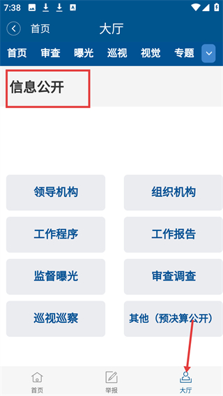 4、大廳信息公開板塊,涵蓋領導機構、組織機構、工作程序、巡視巡察、監督曝光等多項內容,保障信息透明。