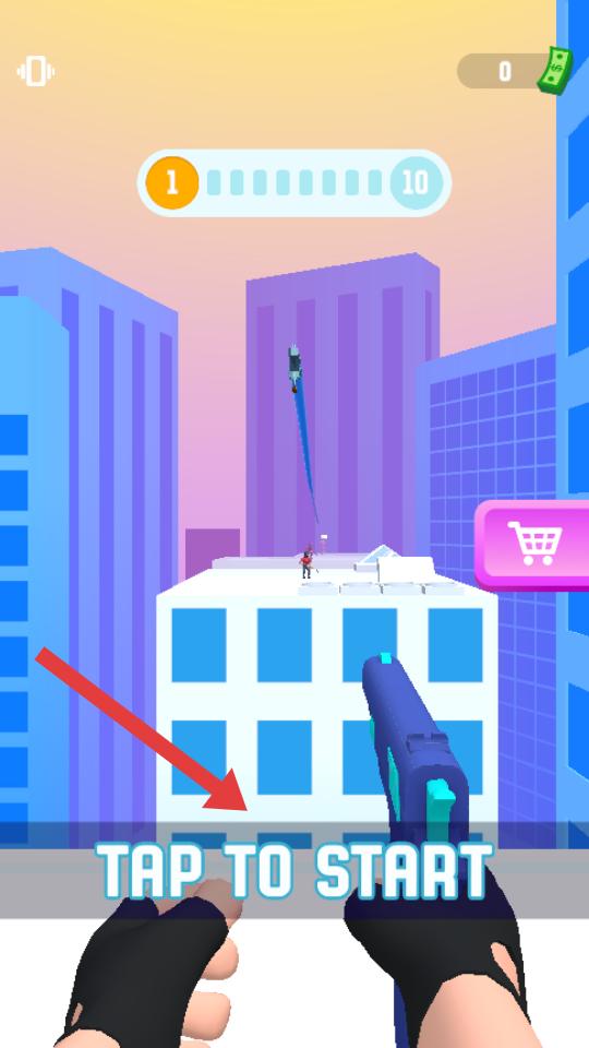 1、游戲開始界面顯示TAP TO START,點擊后進入游戲,可看到城市背景,手持槍械,準備開始射擊挑戰。