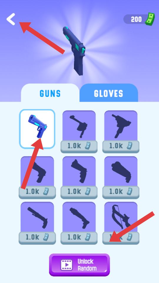 2、進入武器選擇界面,有GUNS,GLOVES分類,可選擇不同槍械,部分需消耗貨幣解鎖,也可解鎖隨機武器。