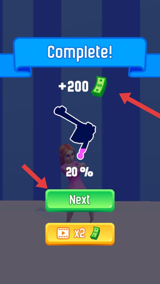 4、成功完成關卡后,界面顯示Complete,獲得200貨幣獎勵,點擊綠色Next按鈕,進入下一個關卡繼續挑戰。