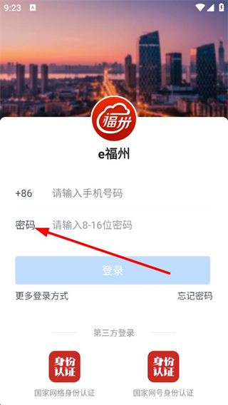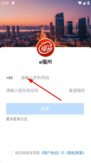 1、打開e福州APP,首先看到登錄界面,顯示福州標志,可輸入手機號碼,獲取并輸入短信驗證碼。