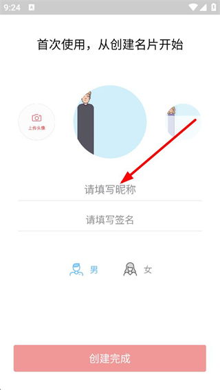 3、首次使用時,需創建名片,可上傳頭像,填寫昵稱和簽名,選擇性別后點擊創建完成,完成個人信息設置。