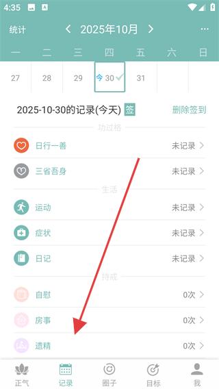 3、點擊記錄進入2025年10月30日的記錄頁面,查看日行一善、三省吾身等記錄項的完成情況如自慰、房事、遺精等數據的記錄,全面掌握自身的戒色進度。