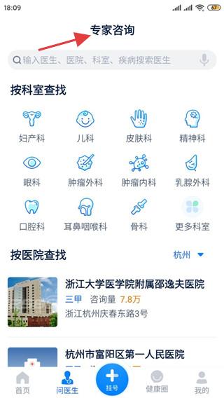 2、專家咨詢頁面,可按科室如婦產科、兒科等或醫院查找專家,有浙江大學醫學院附屬邵逸夫醫院等供選擇。