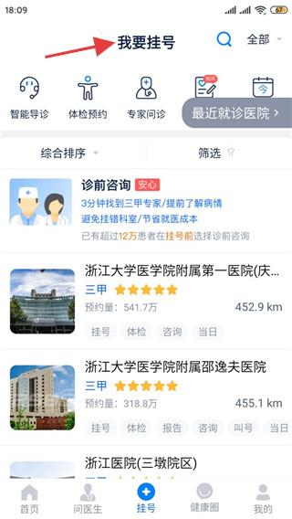 3、我要掛號頁面,能智能導診、預約體檢、專家問診,展示浙江大學醫學院附屬第一醫院等三甲醫院,方便掛號就醫。
