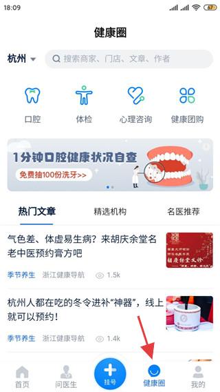 4、健康圈頁面定位杭州,可搜商家等,有口腔、體檢等分類,還有1分鐘口腔健康自查活動,及熱門養生文章推薦。