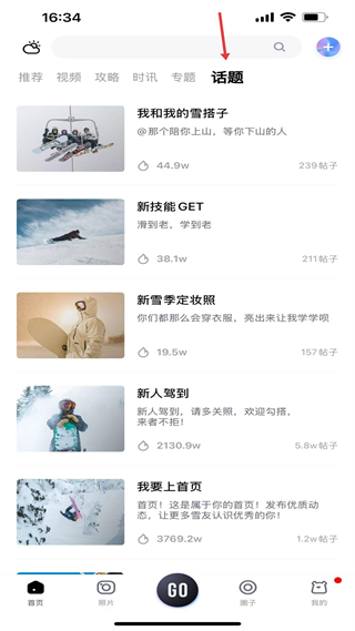 4、話題,設立我和我的雪搭子等社交話題,提供愛好者互動交流板塊,有效增強滑雪社群活躍度。