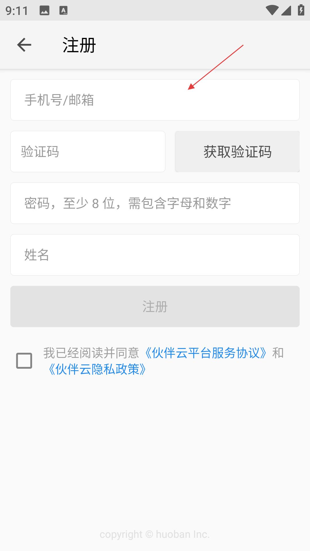 2、注冊頁,填寫手機號、郵箱、驗證碼、密碼8位以上,含字母數字、姓名,勾選協議后點注冊完成賬號創建。