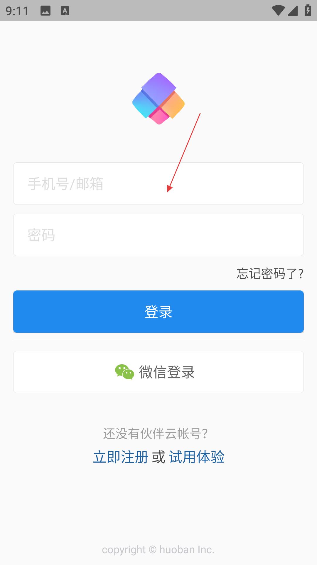 3、登錄頁,輸入手機號、郵箱、密碼可登錄,也能微信登錄,無賬號可注冊或試用體驗。