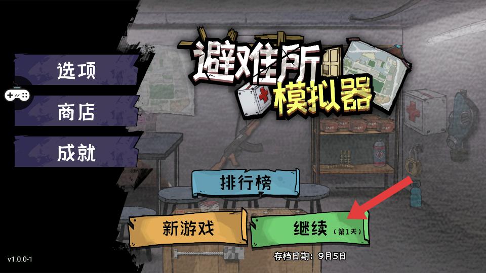 1、進入游戲后,可看到有新游戲,繼續等選項,選擇繼續能接著之前存檔日期的游戲進程,開啟避難所挑戰。