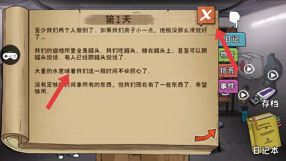 2、在游戲里會有日記記錄,能看到類似第1天的生存情況,像避難所里全是罐頭,還有大量水,能了解當下物資等狀況。