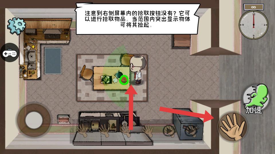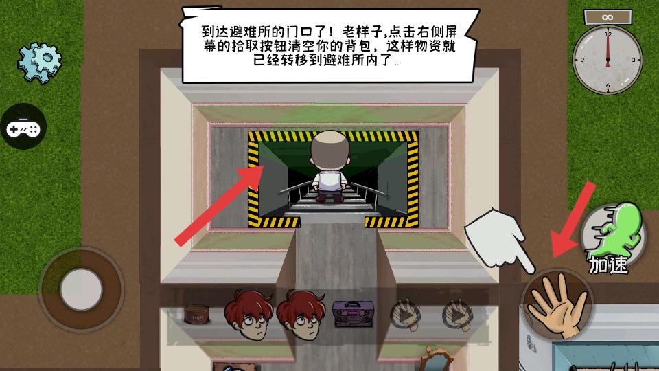 4、到達避難所門口時,點擊右側屏幕的拾取按鈕清空背包,這樣就能把物資轉移到避難所內,為后續生存做準備。