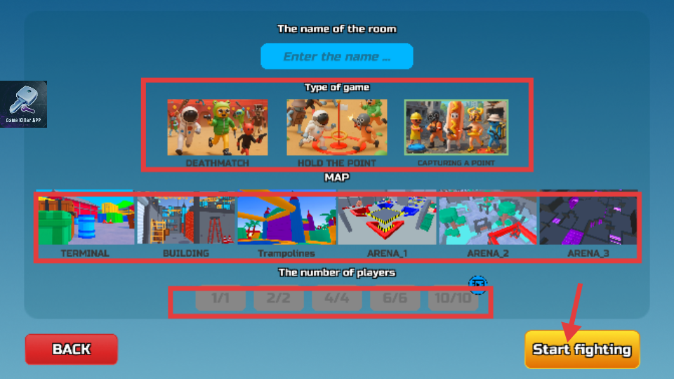 2、在房間設置界面先輸入想要的房間名,接著挑選游戲類型、心儀的地圖以及合適的玩家數量,設置好后點擊Start fighting便可進入游戲。