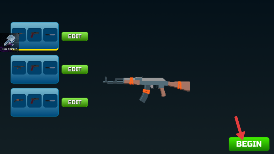3、來到武器界面能查看不同的武器配置組合,要是不需要調整,直接點擊綠色的BEGIN按鈕,就能順利開始游戲。