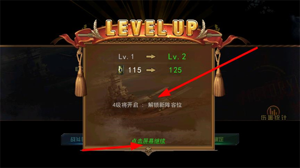 3、升級后會顯示等級提升界面,如從Lv1升至Lv2,4級將開啟新陣位,點擊屏幕可繼續游戲。