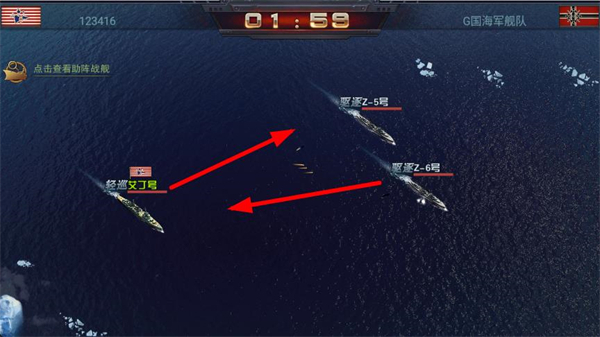 2、在海戰場景里操控己方戰艦如悠藍叉1號,與敵方戰艦如驅逐艦等交戰,推進戰斗。