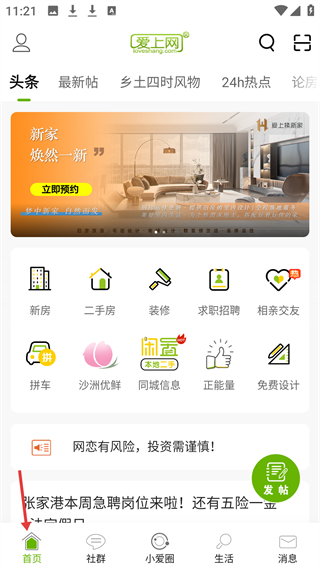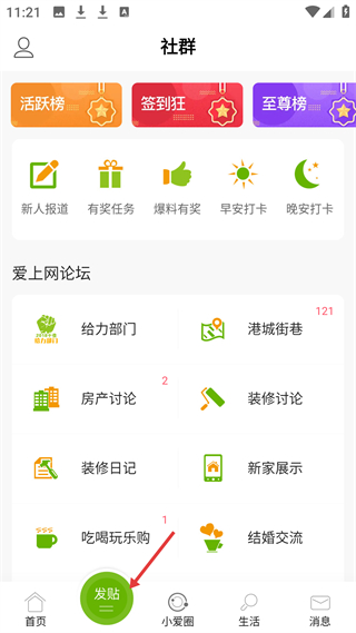 2、社群頁有新人報道、有獎任務等功能,愛上網論壇含房產討論、裝修討論等板塊,可發帖參與社群活動。