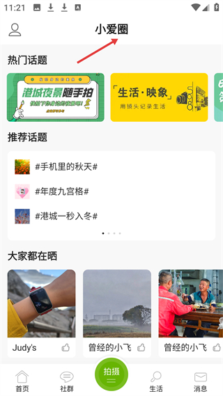 3、小愛圈頁有港城夜景隨手拍等熱門話題,推薦手機里的秋天等話題,展示用戶分享的生活內容,可拍攝分享。