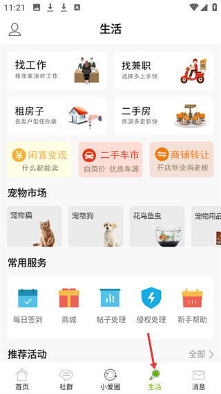 4、生活頁有找工作、租房子等服務入口,還有寵物市場、常用服務板塊,提供閑置變現、二手車市等生活服務。
